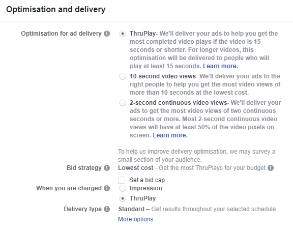 If you decide to use the video views objective, Facebook will deliver your ads using the following optimisation: