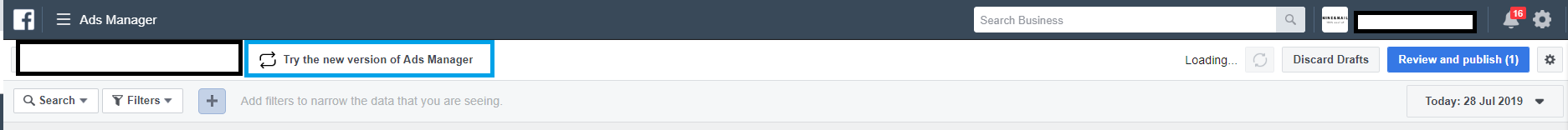 If you’re still seeing the old Ads Manager, then next to your ad account name and ID will be the option to try the new Ads Manager:
