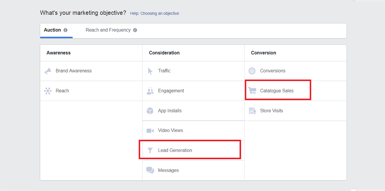 Once that’s done, you can choose the Catalogue Sales or Lead Generation objective to serve the DPAs.