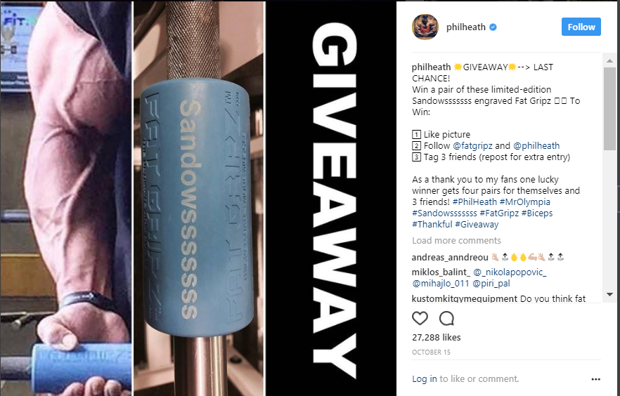 Dozens of brands partner up with Phil Heath to promote their products. You can see an example below from Fat Gripz, which run a competition on Phil’s page: