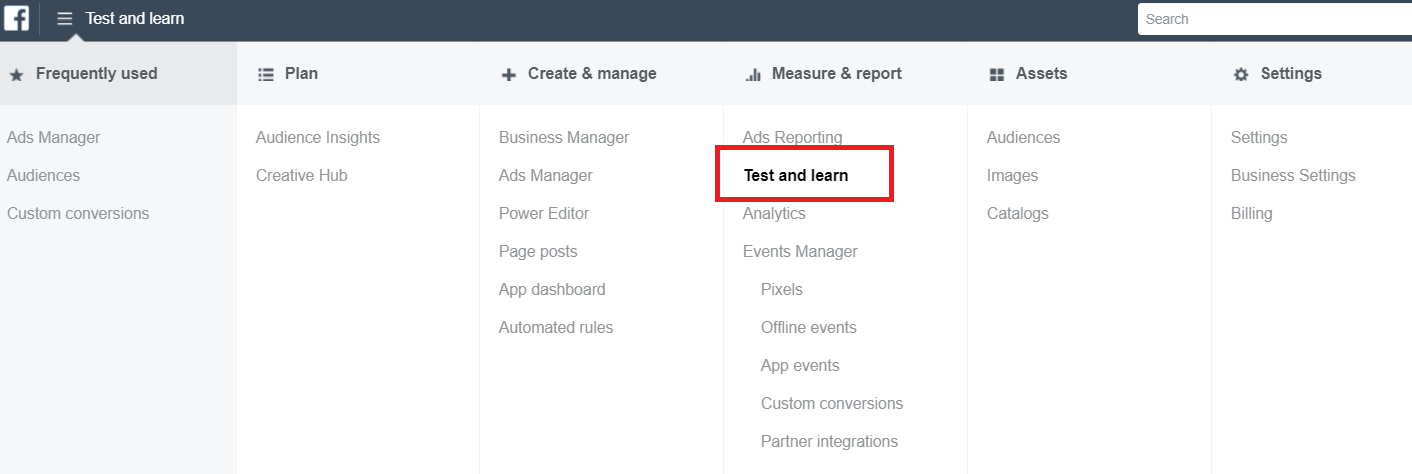 Facebook Test and Learn has its own section within your Business Manager which not only makes testing easy, but provides you with definite answers to your tests without you having to guess or assume anything.