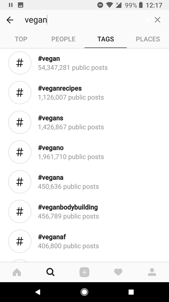 The #vegan hashtag has over 54 million public posts, with the top posts for that day being seen by any user who has followed that hashtag.