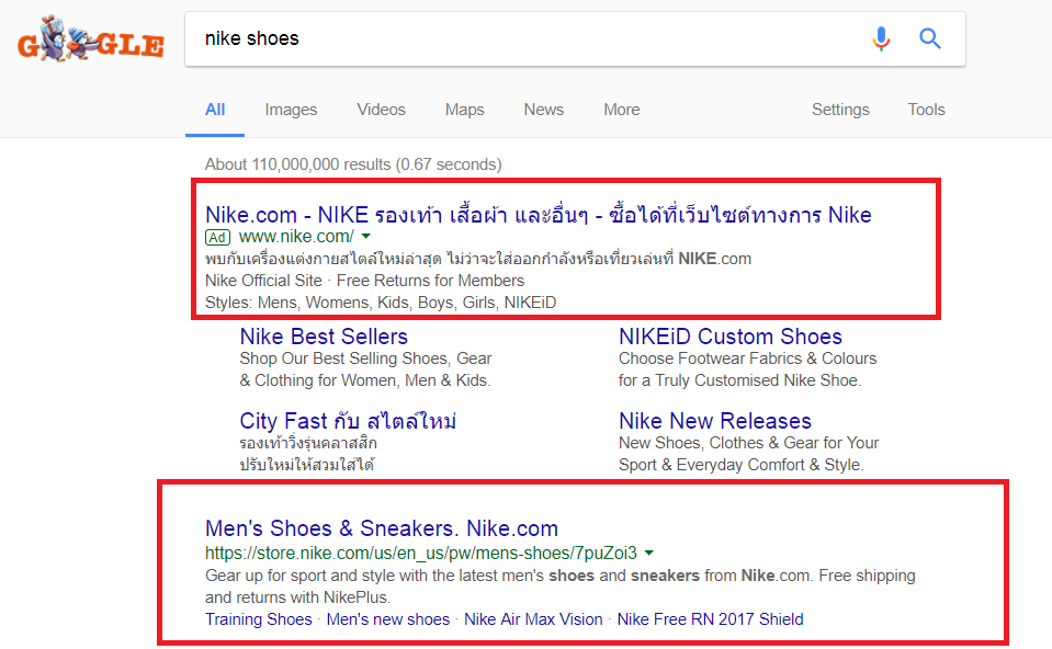 The term Nike Shoes is a branded keyword for Nike, and when you type that keyword into Google Nike is listed #1 in AdWords and organic search.
